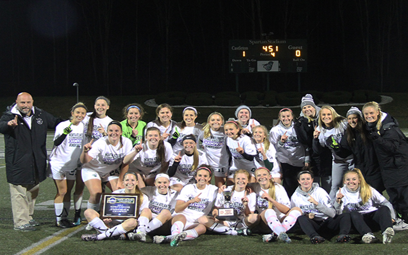 Castleton Men’s and Women’s Soccer made University history, as the two teams respectively won their North Atlantic Conference Championships on Saturday, November 4 in front of a home crowd at Spartan Stadium. Women’s Soccer accomplished a 1-0 victory over Husson University, scoring with less than five minutes remaining in second overtime, while Men’s Soccer defeated Colby-Sawyer 1-0 with the game-winning goal scored with one second remaining in the first half.