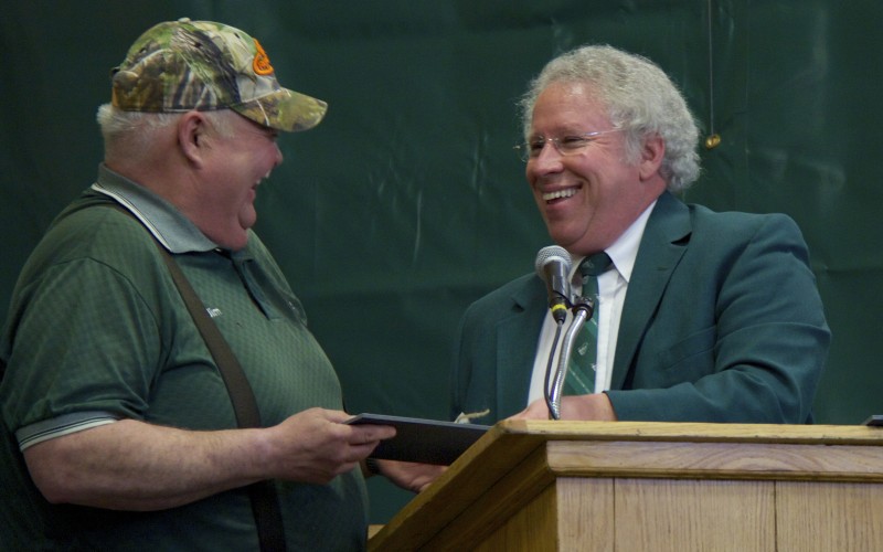On Friday, March 28, hundreds gathered in Glenbrook Gymnasium for the college’s annual Years of Service Celebration. The event celebrated those Castleton employees who had recently surpassed milestone years of service in increments of five. Lyn Adams, associate registrar, and James Waterhouse, lead maintenance worker (pictured above with President Dave Wolk), were honored for an impressive 35 years of service to the college.